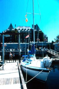 Dreamer, our 1982 O’Day 25 fixed keel moored in front of the Empress Hotel in Victoria.
