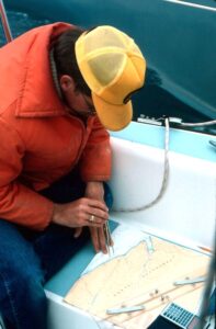 We felt insignificant in the vast grey ocean as the clouds lowered further, enveloping us in a mist. We relied on paper charts, a compass and our eyeballs. A commercial LORAN set was far too expensive and GPS didn’t exist yet. With the reducing visibility I wanted to stay in visual range of the shore to starboard, logging headlands and lighthouses on the chart to assist in navigation along this “Graveyard of the Pacific.” We followed the fathom line on the flasher depth sounder as the mist thickened and almost hid the swells crashing on the nearby shore. This close to shore the swells were coming back from the cliffs. Waves hit us from both sides.