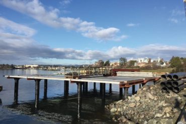The first pilings have been pounded into the ocean floor and a 300-foot dock—the 12-foot-wide anchoring portion of the marina—has...