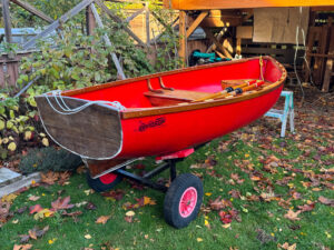 Pat Winram leads me into the backyard of her Oak Bay home where her most recent boat restoration rests on its trailer near a shelter: it’s a cheerful, red-hulled, beautifully restored nine-footer, #3832, constructed by the Davidson MFG. CO. LTD of 1872 West Georgia Street, Vancouver, BC. The dinghy was built in the 1950s. The original mahogany stern is well integrated with the fibreglass hull, making it one of the earliest examples of composite boat work.