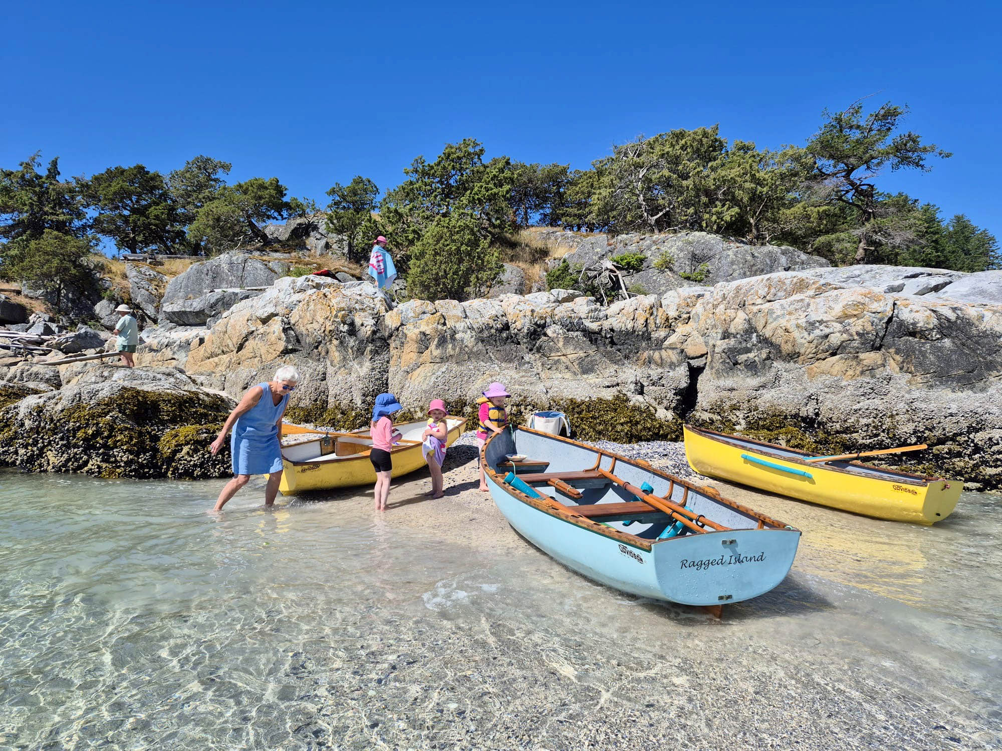 So why does a 77-year-old, former special-ed teacher spend her time restoring a baker’s dozen Davidson rowboats and sailboats? “I was born in Vancouver, the youngest of three,” Pat explained, “but my parents built a cottage on Gambier Island where we spent much time on the water.” A photo of a five-year-old, swimsuit clad girl shows Pat climbing into a nine-foot Davidson dinghy at a Gambier beach; a second photo positions Pat—wearing shorts this time—in the same location climbing into another Davidson 72 years later. Her love for this boat is bred in the bone, and she is committed to highlighting the importance of the Davidsons’ influence on 20th century boats by keeping alive as many as possible.