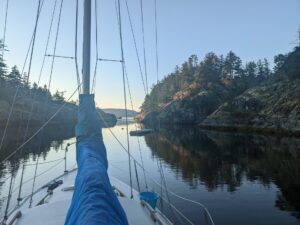 The upland around most of the anchorage is private property, and “no trespassing” signs should be respected. After our reconnoitre around the cove, we rowed back to the boat just in time for cockpit hour. We set ourselves up in the cockpit with our favourite drinks in hand and watched the sun make its transit high above the 50-foot cliff wall lining the south shore. Before long, a small deer appeared on the beach tucked deep into the cranny where we had dropped the hook. The sounds of kingfishers flitting overhead and seals surfacing in the narrow entrance of the cove made for a delightful evening.