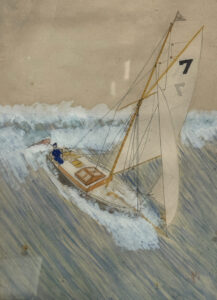 THE EXHIBITION DISPLAYED an original watercolour he painted at age nine. It depicts a gaff-rigged sailboat, sliding down big waves in following winds, towing a nearly submerged dinghy. The sails are well set. It’s a remarkable painting for a child and foreshadows the observational powers and accurate depictions of vessels that later brought him fame. “How did you manage to save that painting for 81 years?” I asked John. “Oh, it was my mum who kept it in a drawer,” he said.