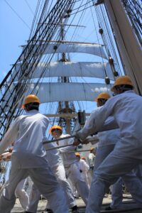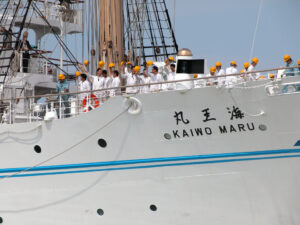 Based in Yokohama, Japan, Kaiwo Maru is a sail training vessel operated by the Japan Agency of Maritime Education and Training for Seafarers, which trains future navigators and engineers. The 361-foot-long, 182-foot-high tall ship boasts four masts and 36 sails that total an impressive 30,000 square feet. Her complement comprises 140 people, including cadets and crew. The massive ship was last in Richmond almost a decade ago, drawing about 75,000 visitors from across the region.