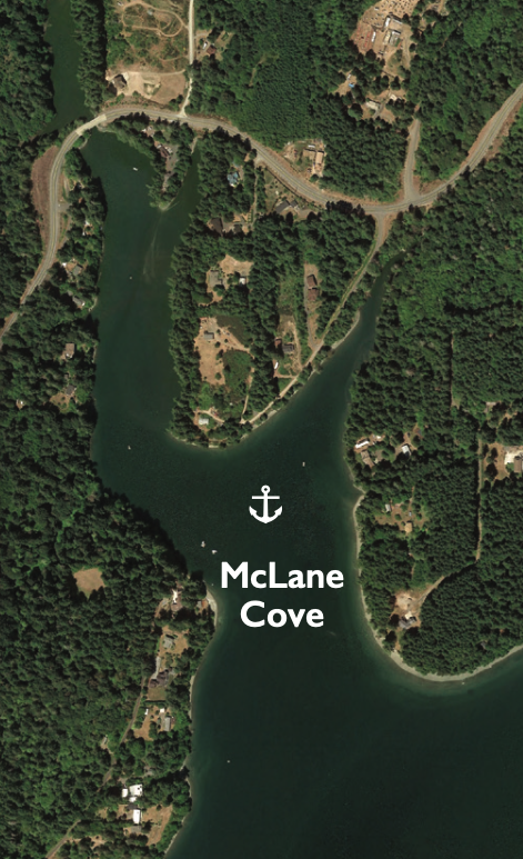 McLane Cove is located at the north end of Pickering Passage, a mile and a half northeast of popular Jarrell Cove on Harstine Island. The approach to this shallow cove is unobstructed, with deeper waters at the cove’s entrance. The shore is populated with modest homes but has a quaint, charming feel.
