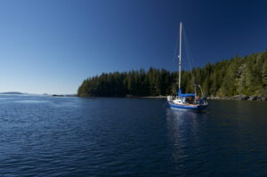 Our timing is perfect. We’ve made good time travelling the 40 miles up Johnstone Strait and are just ducking into Havannah Channel when the weather changes. Strong northwest winds are predicted to build to 40 knots, and the rising wind starts barreling down on our little blue boat. We are heeled over and I check on the kids in the cabin and make sure everything is stowed properly. Tucked into the islands we take down the sails and motor, lining up the markers through shallow Chatham Channel and out into Cutter Cove, adjacent to Minstrel Island.