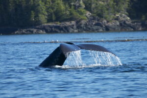 That’s when we hear them. Great exhales and inhales, trumpeting sounds and high-pitched squeals—humpbacks! The fog magically parts just around our boat and we see a heart shaped exhale, knobby backbone, short fin and then the classic tail up and dive down.