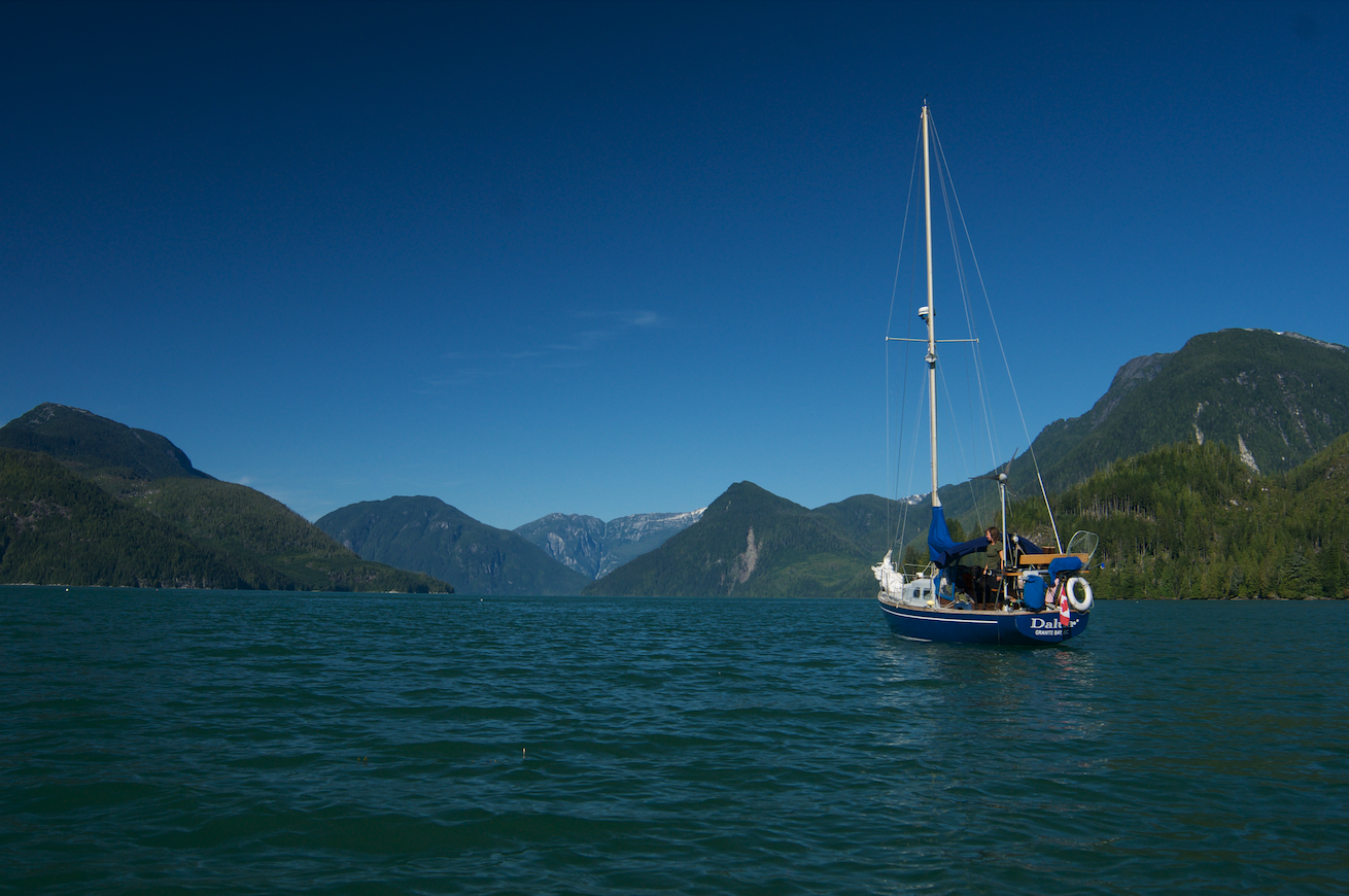 Knight Inlet’s predictable morning outflow winds make for a pleasant trip out of the inlet. Mowat spots a pod of Orcas but they are travelling fast, slicing through the water chasing salmon. I prepare cream cheese and prawn omelettes and we eat on deck, the sun finally rising over the tall peaks of the mainland.